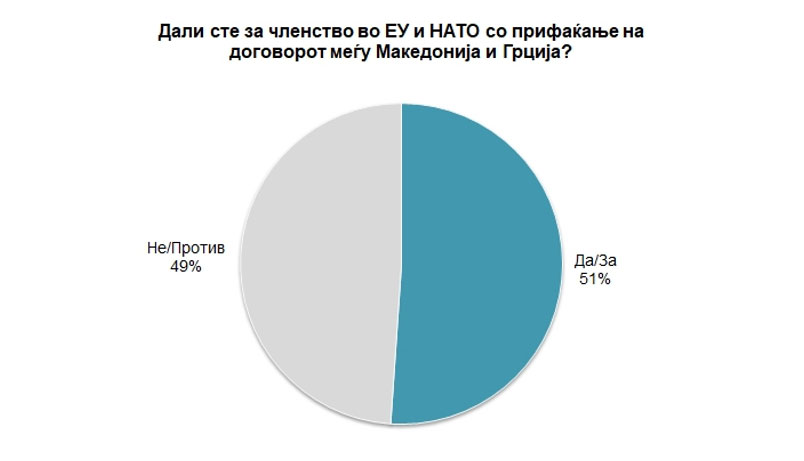Ωστόσο, στο ερώτημα «είστε υπέρ της συμφωνίας με την Ελλάδα για αλλαγή του ονόματος της ‘’Δημοκρατίας της Μακεδονίας’’»; τα αποτελέσματα είναι διαφορετικά: «Όχι» απαντά το 52,6% των ερωτηθέντων, ενώ «ναι» απαντά το 47,4%.