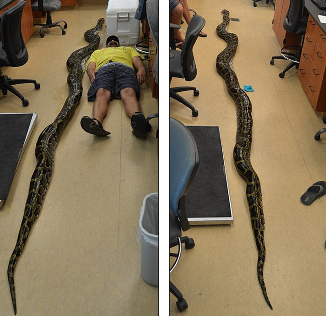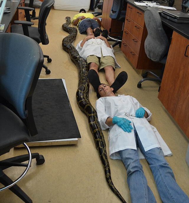 Το θηλυκού γένους ερπετό, πύθωνας της Βιρμανίας, βάρους 58 κιλών, το εντόπισε προ ημερών ο κ. Jason Leon νοτιοανατολικά του Miami.