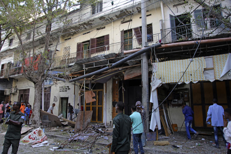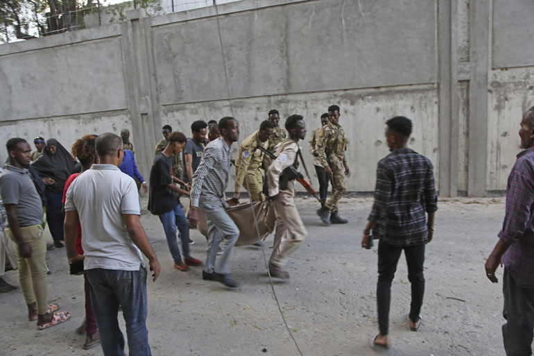 Βομβιστής-καμικάζι πυροδότησε τα εκρηκτικά με τα οποία είχε ζωστεί, προκαλώντας ζημιές σε κτήρια κοντά στο συγκρότημα γραφείων, προτού ξεσπάσουν ανταλλαγές πυρών, δήλωσε ο Σαντίκ Ντουμπίσε, εκπρόσωπος της σομαλικής αστυνομίας, αναφερόμενος στην επίθεση που διήρκεσε περίπου τέσσερις ώρες.