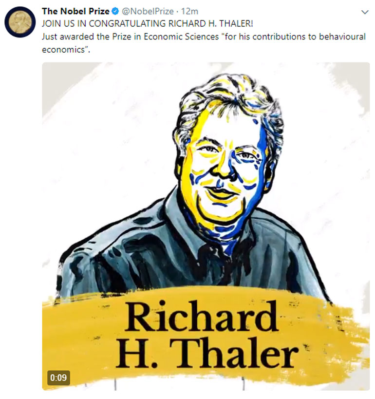 Ο Αμερικανός οικονομολόγος Ρίτσαρντ Θέιλερ κέρδισε το βραβείο Νόμπελ Οικονομίας για το 2017 για τη συνεισφορά του στον τομέα της συμπεριφορικής οικονομικής (behavioural economics), όπως ανακοίνωσε σήμερα η Σουηδική Ακαδημία Επιστημών.