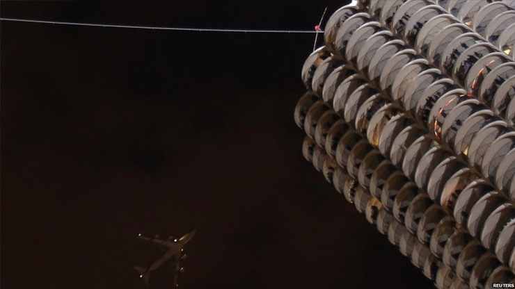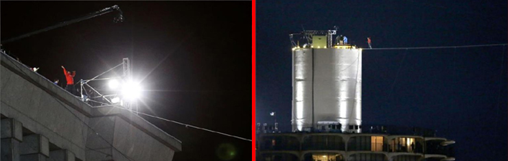 Ο τολμηρός ακροβάτης διέσχισε απόσταση 28 μέτρων ανάμεσα στους ουρανοξύστες «Marina City Τowers» (σήμα κατατεθέν της «Πόλης των Ανέμων») μέσα σε 6 λεπτά και 52 δευτερόλεπτα. Από κάτω του δεν υπήρχε δίχτυ ασφαλείας, ενώ ο ίδιος δεν φορούσε τους ειδικούς ιμάντες που θα του παρείχαν την απαραίτητη προστασία σε ενδεχόμενη πτώση. Η προσπάθεια του 35χρονου ακροβάτη έγινε σε ύψος 152 μέτρων και ενώ η ταχύτητα των ανέμων έφθανε ακόμα και τα 40 χλμ./ώρα.