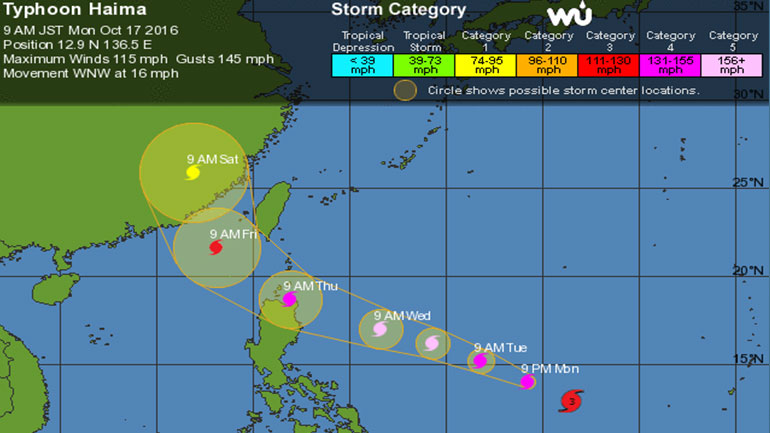 Στο μεταξύ στο Δυτικό Ειρηνικό αναπτύσσεται και ο τυφώνας Haima που αναμένεται να ενισχυθεί σύμφωνα με την πενθήμερη πρόβλεψη της «Weather Underground», σε ένα πολύ ισχυρό τυφώνα (μπορεί να γίνει ισχυρότερος απ’ ότι ο Σαρίκα). Είναι εξαιρετικά πιθανό όπως αναφέρουν οι μετεωρολόγοι ο Haima να μετατραπεί σε σούπερ τυφώνα από την Τρίτη και αναμένεται να αποτελέσει απειλή για τη Λουζόν (νησί των Φιλιππίνων, στο βορειότερο άκρο του αρχιπελάγους).