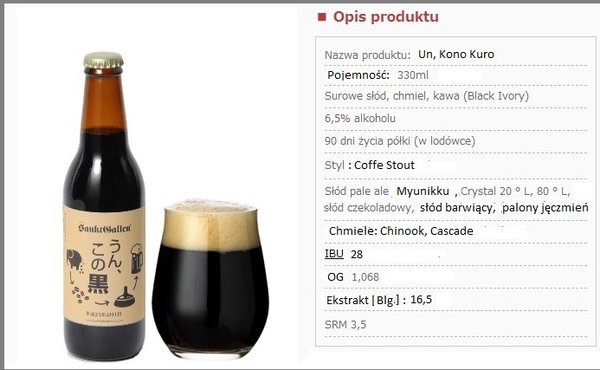 Η μπύρα ονομάζεται Un, Kono Kuro και πωλείται για 90 δολάρια το μπουκάλι ενώ διατίθεται και σε ποτήρι. Σύμφωνα με τις κριτικές, η γεύση της είναι πικρή και αφήνει μια έντονη καυτερή επίγευση στο τέλος.
