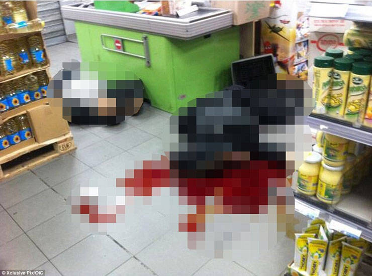 Μία άλλη εικόνα, αποτυπώνει τη φρίκη που εκτυλίχτηκε το απόγευμα της Παρασκευής: Πτώματα ομήρων κείτονται στο έδαφος μέσα σε λίμνη αίματος.