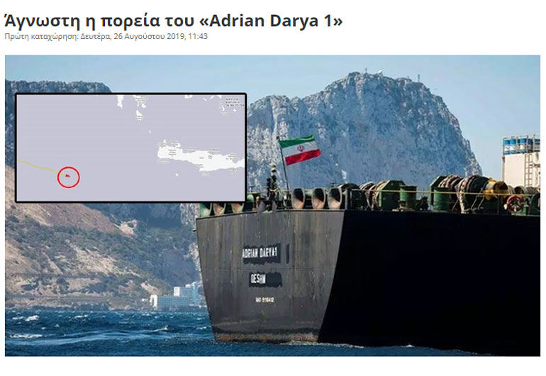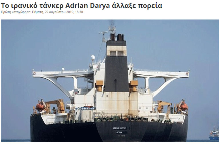 To ιρανικό δεξαμενόπλοιο Adrian Darya 1, το οποίο βρίσκεται υπό παρακολούθηση από όλες τις εμπλεκόμενες χώρες στις συγκρούσεις της Εγγύς και Μέσης Ανατολής, κατευθύνεται αυτήν την ώρα προς το τουρκικό λιμάνι της Αλεξανδρέττας Ιskenderun, στα σύνορα δηλαδή μεταξύ Τουρκίας και Συρίας.