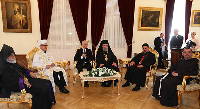 Αφού χαιρέτησε εγκάρδια όλους του θρησκευτικούς ηγέτες, και αφού λήφθηκαν αναμνηστικές φωτογραφίες, αποχώρησαν σε αίθουσα όπου θα πραγματοποιήσουν συνάντηση διάρκειας περίπου πενήντα λεπτών.