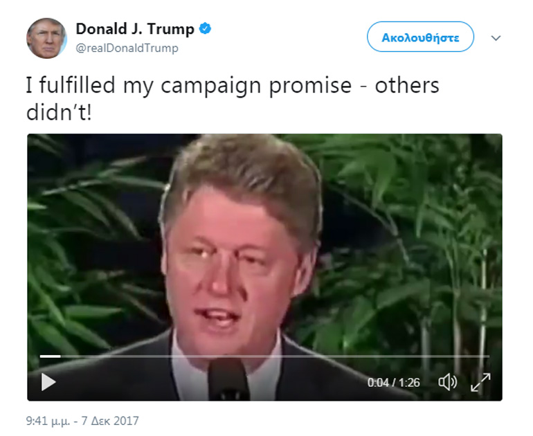 Με ένα μήνυμά του στο Twitter, ο πρόεδρος των ΗΠΑ Ντόναλντ Τραμπ κατηγόρησε τους τρεις προκατόχους του, τον Μπιλ Κλίντον, τον Τζορτζ Ου. Μπους και τον Μπαράκ Ομπάμα, ότι δεν τήρησαν τις δεσμεύσεις τους σε ό,τι αφορά το θέμα της Ιερουσαλήμ.