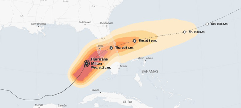 Εξασθενημένος στην Κατηγορία 3 της πεντάβαθμης κλίμακας Σαφίρ-Σίμπσον, ο Μίλτον εξακολουθεί να θεωρείται «ισχυρός» από το Εθνικό Κέντρο Κυκλώνων (NHC) και ο πρόεδρος των ΗΠΑ Τζο Μπάιντεν προειδοποίησε πως αναμένεται να είναι «ένας από τους πιο καταστροφικούς κυκλώνες στη Φλόριντα εδώ και έναν αιώνα».