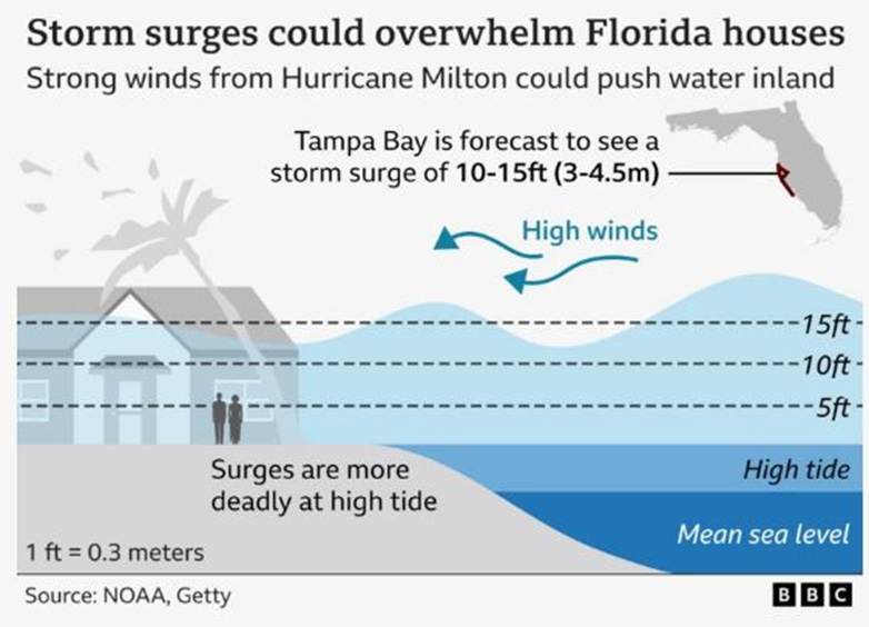 Αξιωματούχοι στην Τάμπα έχουν προειδοποιήσει ότι το κύμα καταιγίδας, που θα προκαλέσει ο Milton στην περιοχή, θα μπορούσε να φτάσει τα 12 έως 15 πόδια, δηλαδή θα είναι διπλάσιο από αυτό που έπληξε την πόλη κατά τη διάρκεια του τυφώνα Χέλεν, τον περασμένο μήνα.