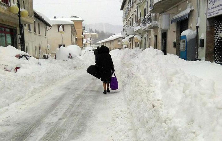 Το χιόνι ξεπερνά σε πολλές περιοχές το ένα μέτρο και φράζει τις εισόδους σπιτιών. Κάτοικοι της περιοχής της πόλης Λ’ Άκουιλα επιχειρούν, παρά το χιόνι και τον πάγο, να απομακρυνθούν από τις εστίες τους και να μεταβούν σε ασφαλέστερα κτήρια.