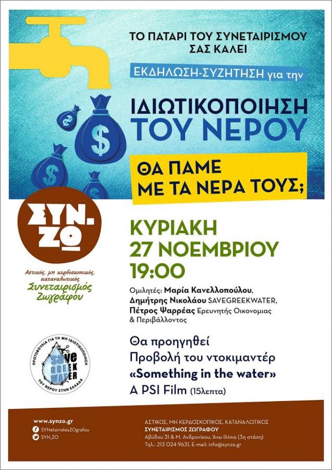 Το Πατάρι του ΣΥΝ.ΖΩ τη Κυριακή 27/11 στις 19.00, στον συνεταιρισμό Ζωγράφου, πραγματοποιεί την εκδήλωση-συζήτηση με θέμα: ΙΔΙΩΤΙΚΟΠΟΙΗΣΗ ΝΕΡΟΥ-ΘΑ ΠΑΜΕ ΜΕ ΤΑ ΝΕΡΑ ΤΟΥΣ;
