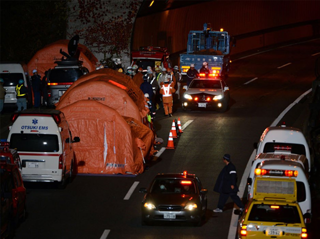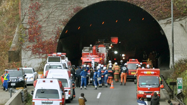 Η κατάρρευση σημειώθηκε λίγο μετά τις 08.00 το πρωί της Κυριακής, τοπική ώρα (01.00 τα ξημερώματα ώρα Ελλάδος), με πυκνό μαύρο καπνό να βγαίνει μέσα από τη σήραγγα. Όπως μετέδωσε το ιαπωνικό κρατικό κανάλι NHK, ο οδηγός ενός φορτηγού ήταν από τους πρώτους που τηλεφώνησε στην Αστυνομία προκειμένου να ζητήσει βοήθεια, ωστόσο τέσσερις ώρες αργότερα εντοπίστηκε νεκρός.
