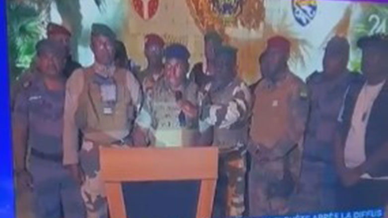 Ομάδα δέκα και πλέον αξιωματικών των ενόπλων δυνάμεων της Γκαμπόν εμφανίστηκε ξαφνικά τις πρώτες πρωινές ώρες σήμερα μπροστά στις κάμερες της κρατικής τηλεόρασης, που έχει την έδρα της πλάι στην προεδρία, και μέλος της ανέγνωσε ανακοίνωση που αναφέρει πως οι εκλογές ακυρώνονται και «όλοι οι θεσμοί της Δημοκρατίας» καταλύονται.