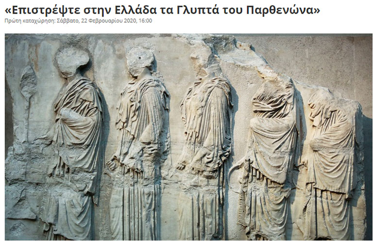 Υπέρ της επιστροφής των γλυπτών του Παρθενώνα στην Ελλάδα, τάσσεται σε άρθρο γνώμης η συντάκτρια των Sunday Times, Sarah Baxter. Καλεί μάλιστα τον Βρετανό πρωθυπουργό, Μπόρις Τζόνσον, «να επιστρέψει τα γλυπτά στην Αθήνα γιατί εκεί ανήκουν», γεγονός που θα αποτελούσε «μια μεγάλη χειρονομία φιλίας και αλληλεγγύης».