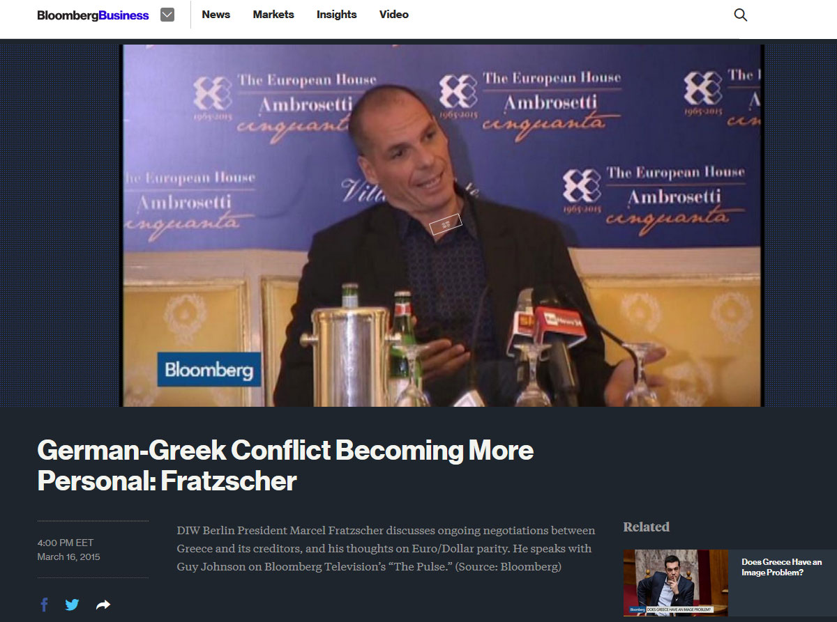 Το ειδησεογραφικό πρακτορείο Bloomberg προβάλλει δηλώσεις του προέδρου του γερμανικού ινστιτούτου DIW Marcel Fratzscher, ο οποίος, μεταξύ άλλων, υποστηρίζει ότι «η σύγκρουση Ελλάδας-Γερμανίας καθίσταται ολοένα και πιο προσωπική (μεταξύ των υπουργών Οικονομικών των δύο χωρών)» επισημαίνοντας ότι «η Ελλάδα θέλει το γερμανικό χρήμα, αλλά δεν θέλει να κάνει μεταρρυθμίσεις».