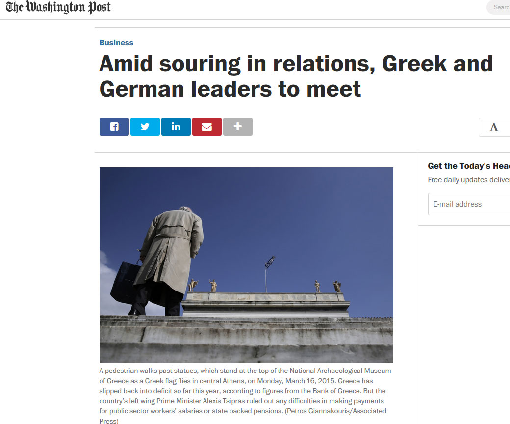 Για το ίδιο θέμα η Washington Post αναφέρει ότι «εν μέσω όξυνσης στις σχέσεις, θα συναντηθούν οι ηγέτες Ελλάδας και Γερμανίας» και ότι «θα είναι η πρώτη επίσκεψη του Έλληνα πρωθυπουργού Αλέξη Τσίπρα, στη Γερμανία, η οποία έχει μεγάλη συνεισφορά στο πρόγραμμα διάσωσης της Ελλάδας και έχει επιμείνει στο να τηρήσει η Ελλάδα τα μέτρα λιτότητας, αν θέλει να λάβει περισσότερα δάνεια σωτηρίας».