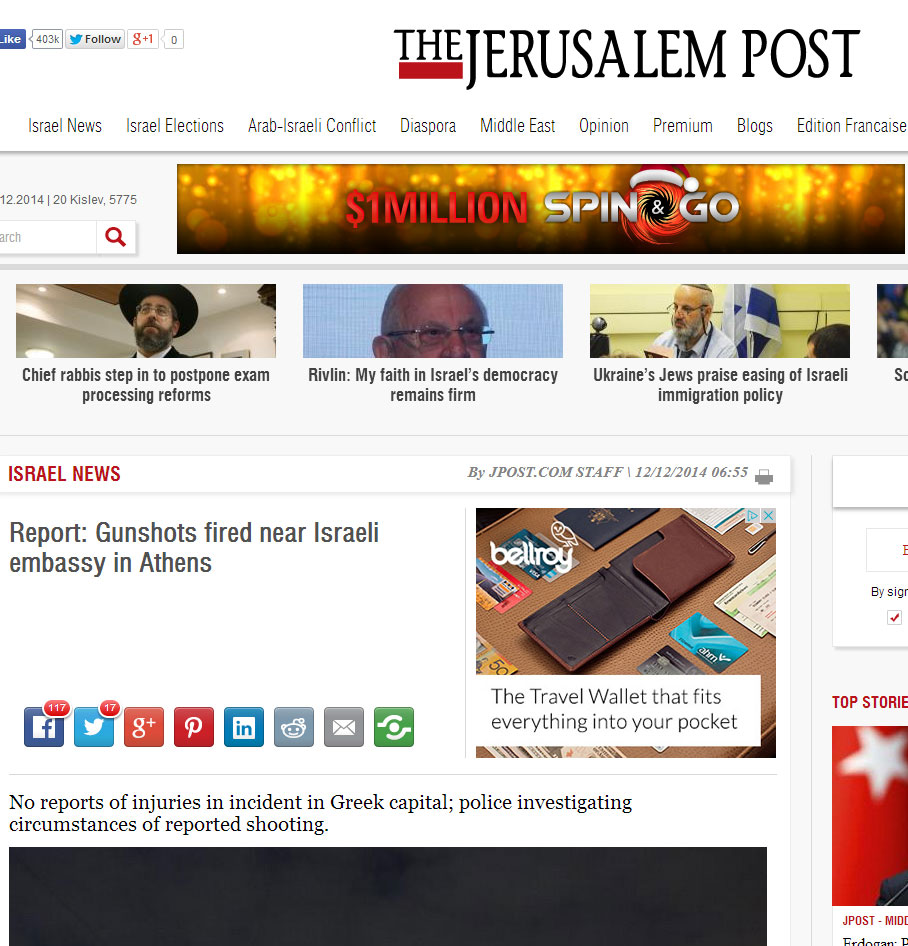 Η Jerusalem Post σε δημοσίευμά της με τίτλο «Αναφορές για πυροβολισμούς κοντά στην πρεσβεία του Ισραήλ στην Αθήνα, τονίζει σχετικά με το περιστατικό ότι η «Ελλάδα διακρίνεται από αντί-ισραηλινά συναισθήματα καθώς το κοινό αίσθημα είναι υπέρ των Παλαιστινίων».