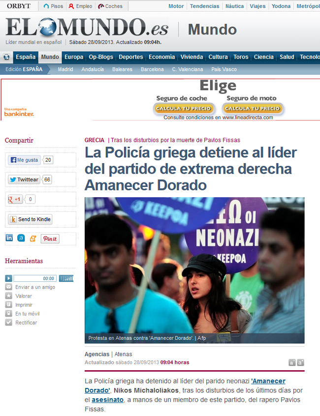 «Η ελληνική αστυνομία σταματά τον αρχηγό της Χρυσής Αυγής», τιτλοφορείται το σχετικό άρθρο της ισπανικής El Mundo: