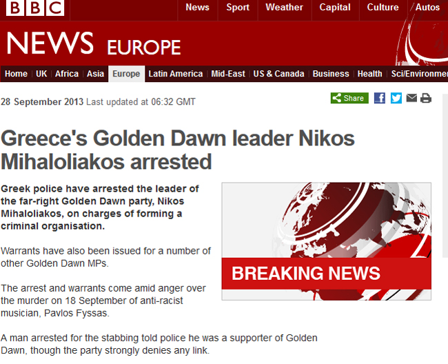 Τον γύρο του κόσμου κάνει η είδηση της σύλληψης του Νίκου Μιχαλολιάκου και βουλευτών-μελών της Χρυσής Αυγής. Σε έκτακτη ανάρτηση το δίκτυο BBC, αναφέρει ότι ο Γ.Γ. της Χρυσής Αυγής συνελήφθη από την αστυνομία κατηγορούμενος για σύσταση εγκληματικής οργάνωσης.