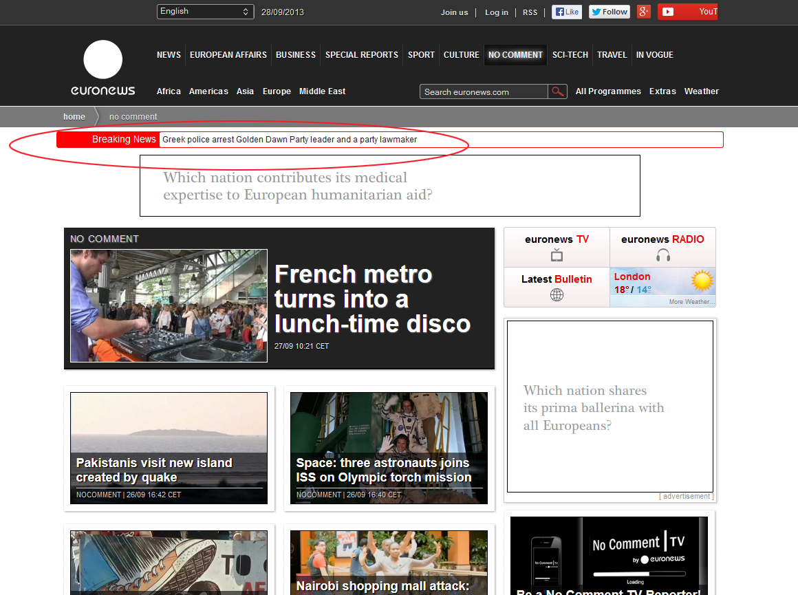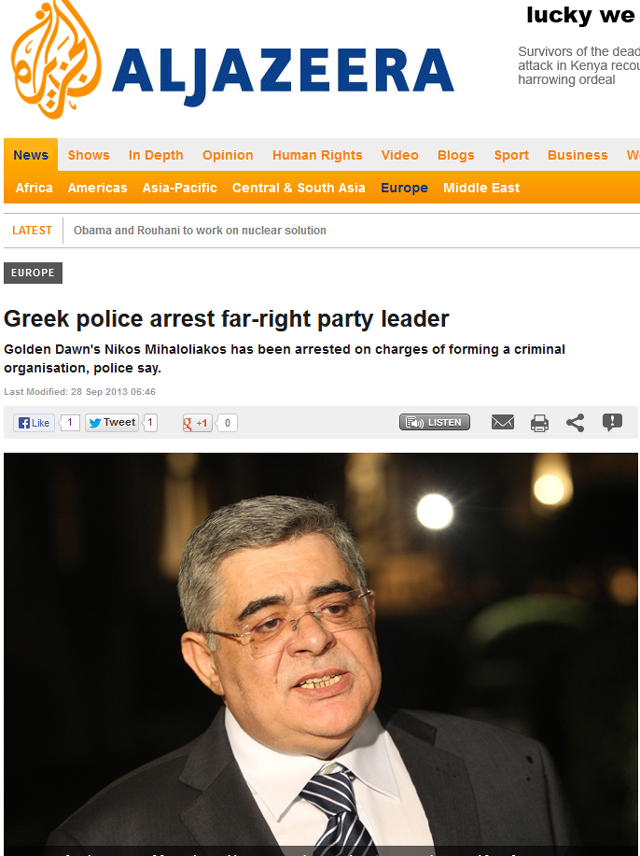 Με έκτακτη ανάρτηση το euronews ενημερώνει πως «η Αστυνομία προχώρησε στη σύλληψη του ηγέτη της Χρυσής Αυγής».