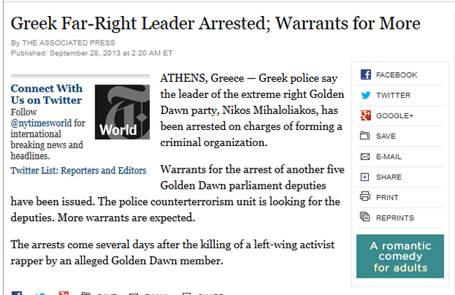 Στην επιχείρηση της ΕΛ.ΑΣ. για τη σύλληψη στελεχών του κόμματος αναφέρονται και οι New York Times, λέγοντας ότι έχουν εκδοθεί εντάλματα για πέντε ακόμη βουλευτές.