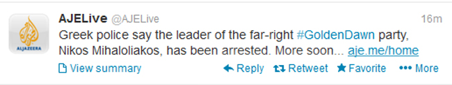 Το Al Jazeera, επίσης ενημέρωσε μέσω έκτακτης ανάρτησης στο twitter για τη σύλληψη του Ν. Μιχαλολιάκου και λίγο αργότερα με ανάρτηση στην πρώτη του σελίδα.