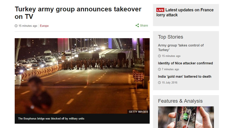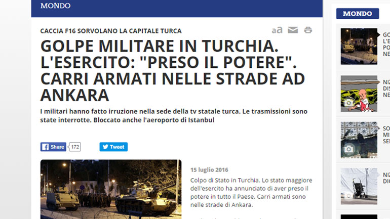 Η αναφορά της ιταλικής τηλεόρασης RAI για το συμβάν «Στρατιωτικό πραξικόπημα στη Τουρκία, ο στρατός πήρε την εξουσία με άρματα»