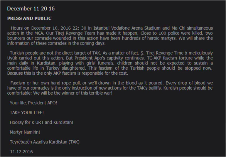 Η κουρδική αποσχιστική οργάνωση «Γεράκια του Κουρδιστάν» (TAK), η οποία προέρχεται από τις τάξεις του Κόμματος Εργαζομένων Κουρδιστάν (PKK), ανέλαβε την ευθύνη για τη βομβιστική επίθεση, το βράδυ του Σαββάτου, στην Κωνσταντινούπολη, η οποία κόστισε τη ζωή σε τουλάχιστον 38 ανθρώπους και τον τραυματισμό άνω των 150.