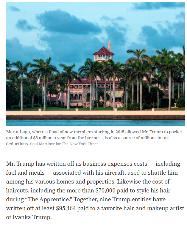 Την ίδια ώρα, η εφημερίδα υποστηρίζει πως ο Αμερικανός Πρόεδρος λάμβανε φορολογικές εκπτώσεις με προσωπικά έξοδα, όπως έξοδα στέγασης, έξοδα για τα αεροσκάφη του, αλλά δηλώνοντας συν τοις άλλοις 70.000 δολάρια για το styling των μαλλιών του μόνο κατά τη διάρκεια της εκπομπής The Apprentice. Επιπλέον, δήλωσε ως… επαγγελματικό έξοδο αμοιβή 100.000 δολαρίων στην αγαπημένη hair stylist και makeup artist της κόρης του Ιβάνκα.