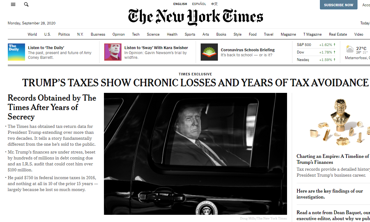 Oι New York Times, σε δημοσίευμά τους, παρουσιάζουν ένα εκτενές ρεπορτάζ σχετικά με τα περιουσιακά στοιχεία του Ντόναλντ Τραμπ, αποκαλύπτοντας, μεταξύ άλλων, πως ο Αμερικανός πρόεδρος πλήρωσε μόλις 750 δολάρια σε ομοσπονδιακούς φόρους εισοδήματος τόσο το 2016 όσο και το 2017, όπου δήλωσε μεγάλες απώλειες από τις επιχειρηματικές του δράσεις.