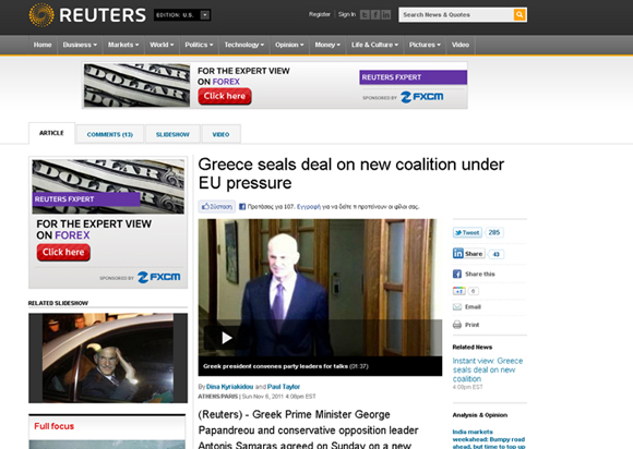 «Ο Έλληνας πρωθυπουργός Γιώργος Παπανδρέου και ο συντηρητικός αρχηγός της αξιωματικής αντιπολίτευσης Αντώνης Σαμαράς συμφώνησαν την Κυριακή πάνω σε ένα νέο κυβερνητικό συνασπισμό ο οποίος θα εγκρίνει τη Συμφωνία της Συνόδου Κορυφής της ευρωζώνης, πριν τη διεξαγωγή εκλογών, αναφέρει στην ανακοίνωσή της η Προεδρία», συνεχίζει το ρεπορτάζ.