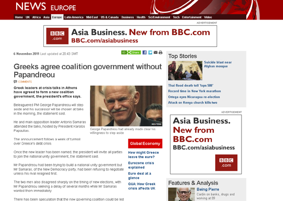 «Οι Έλληνες συμφωνούν σε συνασπισμό κυβέρνησης χωρίς τον Παπανδρέου», αναφέρει στον τίτλο του το πρωτοσέλιδο του BBC, ενώ στο ρεπορτάζ του συνεχίζει, αναφέροντας: «Οι Έλληνες ηγέτες συμφώνησαν κατά τη διάρκεια κρίσιμων διαβουλεύσεων στην Αθήνα να σχηματίσουν ένα νέο κυβερνητικό σχηματισμό, σύμφωνα με την ανακοίνωση της Προεδρίας».