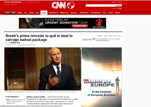 «Ο Έλληνας πρωθυπουργός συμφώνησε να παραιτηθεί για να εκταμιευθεί το πακέτο διάσωσης», είναι ο τίτλος της ηλεκτρονικής σελίδας του CCN. «Ο Έλληνας πρωθυπουργός Γιώργος Παπανδρέου θα αποσυρθεί από το αξίωμα του πρωθυπουργού, ανακοίνωσε την Κυριακή το βράδυ ο πρόεδρος της χώρας, με τη συμφωνία ότι θα το πράξει υπό την προϋπόθεση ότι η αμφιλεγόμενη συμφωνία των 130 δισ. ευρώ για τη διάσωση του ευρώ θα εγκριθεί», αναφέρει το αμερικανικό δίκτυο στην εισαγωγή του πρωτοσέλιδου άρθρου.