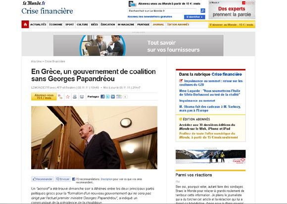 «Στην Ελλάδα, μία κυβέρνηση συνασπισμού χωρίς τον Γιώργο Παπανδρέου», είναι ο τίτλος του άρθρου της ηλεκτρονικής έκδοσης της «Le Monde». «Την Κυριακή το βράδυ, στην Αθήνα, βρέθηκε μία “συμφωνία” ανάμεσα στα δυο μεγάλα ελληνικά πολιτικά κόμματα για τον “σχηματισμό μίας νέας κυβέρνησης της οποίας δεν θα ηγείται ο τωρινός πρωθυπουργός Γιώργος Παπανδρέου”, ανέφερε ένα ανακοινωθέν της προεδρίας της δημοκρατίας», συνεχίζει η εφημερίδα.