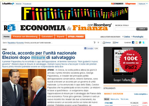 Η ιταλική «Repubblica» αναφέρει στον τίτλο του άρθρου της: «Ελλάδα, συμφωνία για εθνική ενότητα. Εκλογές μετά το σχέδιο διάσωσης» και προσθέτει: «Ο πρωθυπουργός Παπανδρέου συναντήθηκε με τον αρχηγό της αντιπολίτευσης. Μετά το τέλος της συνάντησης, η ανακοίνωση (αναφέρει): “(Ο Παπανδρέου) δεν θα ηγείται της νέας κυβέρνησης”. Εκλογές μετά το σχέδιο διάσωσης. Αύριο (τη Δευτέρα) τετ α τετ διαβουλεύσεις για το όνομα του (νέου) πρωθυπουργού. Ακούγεται πως νέος πρωθυπουργός μπορεί να είναι ο πρώην αντιπρόεδρος της ΕΚΤ».