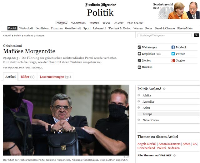 Στη «Frankfurter Allgemeine Zeitung» το σχετικό ρεπορτάζ έχει τίτλο «Μαφιόζικη αυγή» και αναφέρεται εκτενώς στις διαδικασίες που ακολουθούνται από την ελληνική δικαιοσύνη. Και σε αυτό το δημοσίευμα τίθεται το ερώτημα πώς θα κινηθούν οι ψηφοφόροι της Χρυσής Αυγής και εκτιμάται ότι με τις δηλώσεις του ο Νίκος Δένδιας σχολίασε τις συλλήψεις σαν να έχει βγει το πόρισμα. Γίνεται, επίσης, αναφορά στις επιφυλάξεις ως προς το αν οι κατηγορίες θα αποδειχθούν κατά τη διάρκεια της δίκης και παρατίθεται σχετικό δημοσίευμα της ελληνικής εφημερίδας «Καθημερινή», το οποίο τονίζει ότι κατά τη δίκη θα πρέπει να αποδειχθούν οι εγκληματικές πράξεις και να μην υπάρξει δίωξη πολιτικών φρονημάτων.