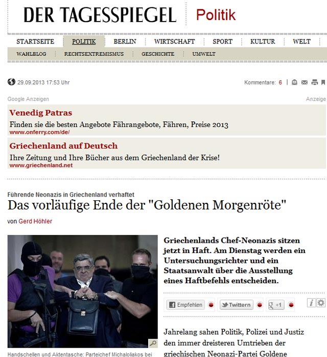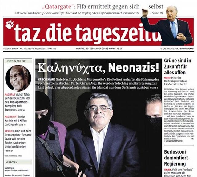 H εφημερίδα «Τageszeitung» δημοσιεύει στην πρώτη σελίδα φωτογραφία του επικεφαλής της Χρυσής Αυγής, Νίκου Μιχαλολιάκου, με χειροπέδες, με τίτλο «Καληνύχτα (σ.σ. στα ελληνικά), Νεοναζί» και λεζάντα: «Ελλάδα: Καληνύχτα, «Χρυσή Αυγή». Σε σχετικό σχόλιο αναφέρεται ότι και στη Γερμανία κάποιοι θα επιθυμούσαν να δουν νεοναζί με χειροπέδες, εννοώντας τα μέλη του ναζιστικού κόμματος της Γερμανίας (NPD) και υπενθυμίζεται ότι διεξάγεται εδώ και χρόνια η συζήτηση περί απαγόρευσης του κόμματος. Διευκρινίζεται, ωστόσο, ότι στην Ελλάδα απαγγέλθηκαν ποινικές κατηγορίες και δεν υπήρξε δίωξη πολιτικών φρονημάτων.