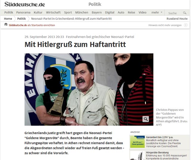 Στη «Sueddeutsche Zeitung» ο τίτλος είναι «Με χιτλερικό χαιρετισμό στη φυλακή» και αναφέρεται στην εμφάνιση του βουλευτή της Χρυσής Αυγής Χρήστου Παππά χθες στη ΓΑΔΑ.