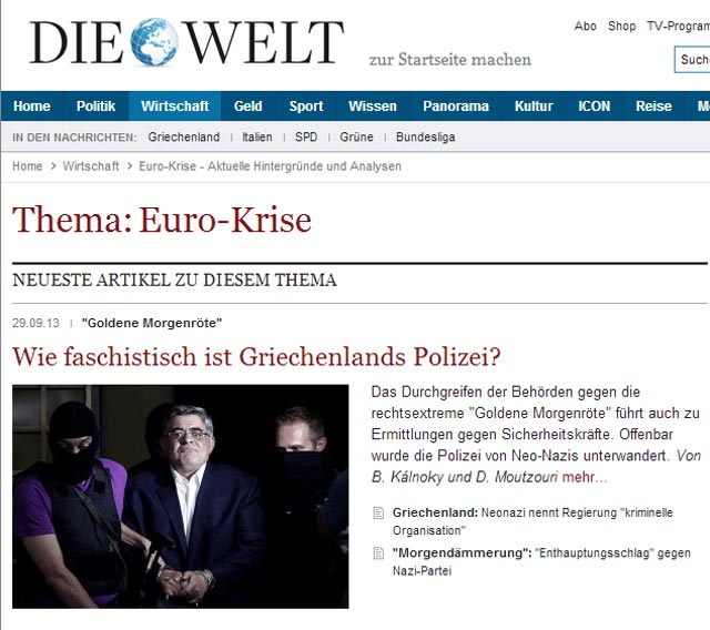 «Πόσο φασιστική είναι η ελληνική αστυνομία;» είναι ο τίτλος άρθρου που δημοσιεύεται στην εφημερίδα «Die Welt» και αναφέρει ότι «η επέμβαση της δικαιοσύνης εναντίον της Χρυσής Αυγής οδηγεί και σε έρευνες σε βάρος των δυνάμεων ασφαλείας».