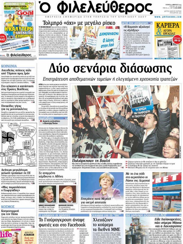 «Ο ΦΙΛΕΛΕΥΘΕΡΟΣ»: «Δύο σενάρια διάσωσης. Επιστράτευση αποθεματικών ταμείων ή ελεγχόμενη χρεοκοπία τραπεζών».