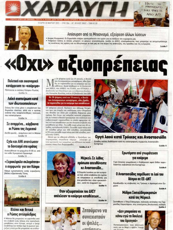 Η καταψήφιση του νομοσχεδίου για το «κούρεμα» των καταθέσεων κυριαρχεί, όπως είναι αναμενόμενο, στα πρωτοσέλιδα του κυπριακού Τύπου.