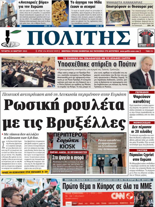 «ΠΟΛΙΤΗΣ»: «Ρωσική ρουλέτα με τις Βρυξέλλες. Πειστική αντιπρόταση από τη Λευκωσία περιμένουν στην Ευρώπη».
