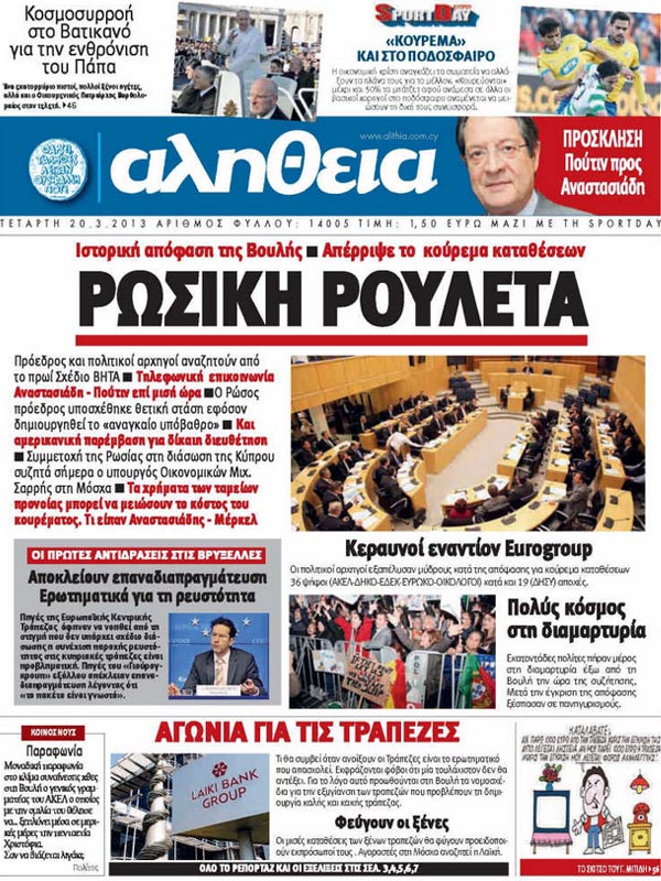 «ΑΛΗΘΕΙΑ»: «Ρωσική ρουλέτα. Ιστορική απόφαση της Βουλής. Απέρριψε το κούρεμα καταθέσεων».