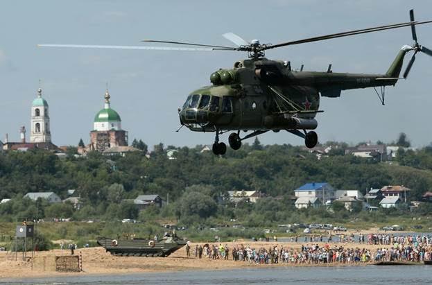 3. Tο Mil Mi-8 είναι μεταγωγικό ελικόπτερο εφοδιασμένο με δύο τουρμπίνες και παράγεται από την εποχή της Σοβιετικής Ένωσης. Σήμερα χρησιμοποιείται όχι μόνο για τη μεταφορά οπλιτών, αλλά και ως κανονιοφόρο παρατηρητήριο και κέντρο διεύθυνσης πυρός.