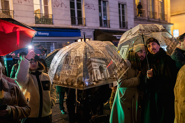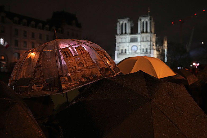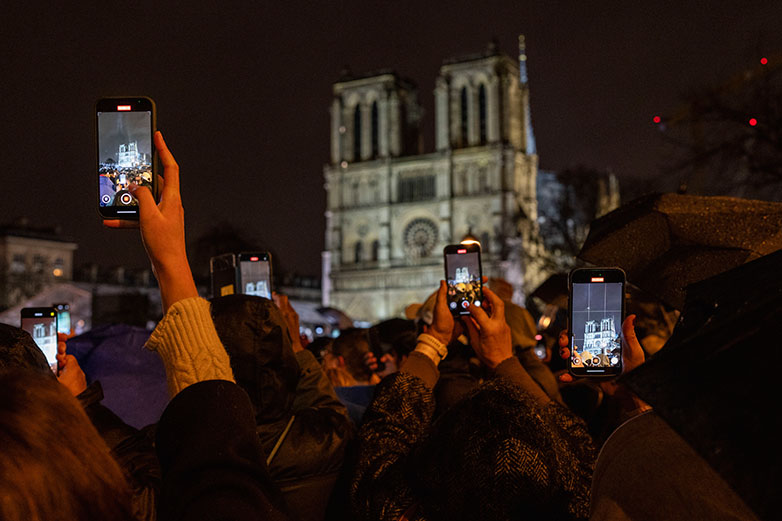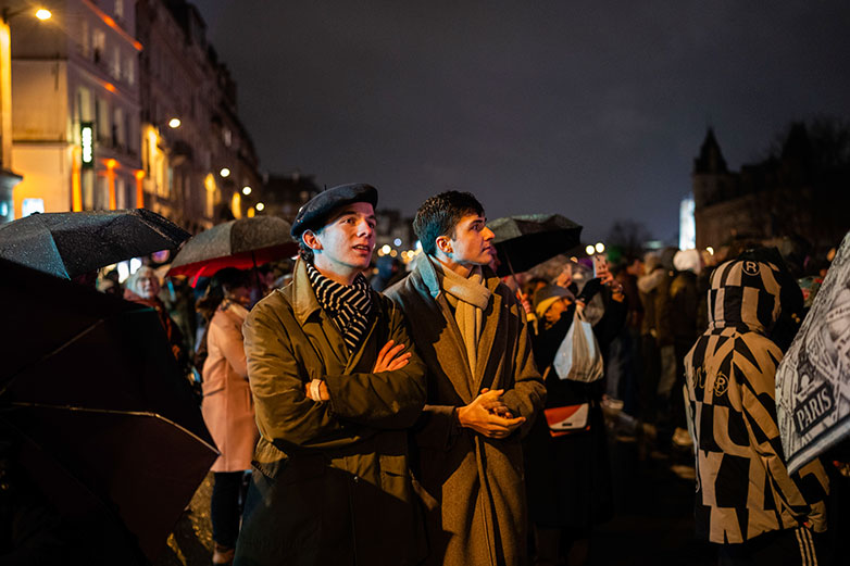 Πλήθος κόσμου βγήκε στους δρόμους του Παρισιού υπό βροχή και παρακολούθησε από γιγαντοοθόνες τα θυρανοίξια του καθεδρικού ναού. Έξω από την Παναγία των Παρισίων εκτιμάται ότι συγκεντρώθηκαν περισσότερα 40.000 άτομα, κάτω από δρακόντεια μέτρα ασφαλείας και παρακολούθησαν με κατάνυξη την τελετή από γιγαντοοθόνες.