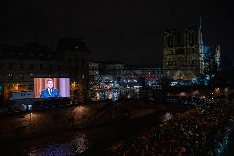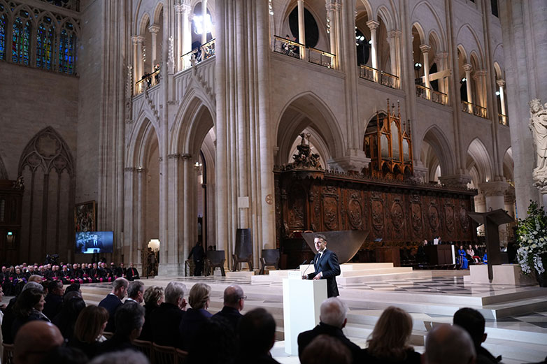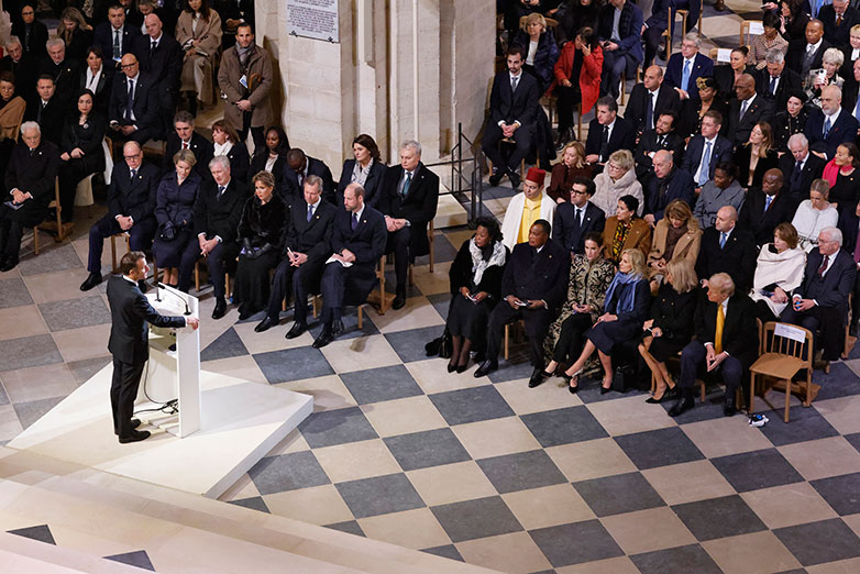 «Στέκομαι μπροστά σας για να εκφράσω την ευγνωμοσύνη του γαλλικού έθνους, την ευγνωμοσύνη μας σε όλους όσους έσωσαν, βοήθησαν και ανοικοδόμησαν τον καθεδρικό ναό», δήλωσε ο Γάλλος πρόεδρος.
