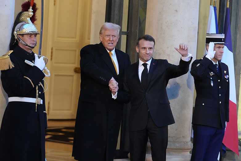 Κατά την άφιξή του, ο Ντόναλντ Τραμπ είχε θερμή χειραψία με τον Εμανουέλ Μακρόν, στα σκαλιά του προεδρικού μεγάρου μπροστά από τη Ρεπουμπλικανική Φρουρά.