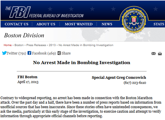 Στις 22.00 ώρα Ελλάδας, το FBI προχώρησε σε επίσημη ανακοίνωση σύμφωνα με την οποία δεν υπήρξε σύλληψη υπόπτου. Η Ομοσπονδιακή Υπηρεσία κάλεσε τα Μέσα Ενημέρωσης να είναι περισσότερο προσεκτικά και να διασταυρώνουν τις πληροφορίες, με τους επίσημους εκπροσώπους της αστυνομίας, του υπ. Δικαιοσύνης και του ίδιου του FBI.