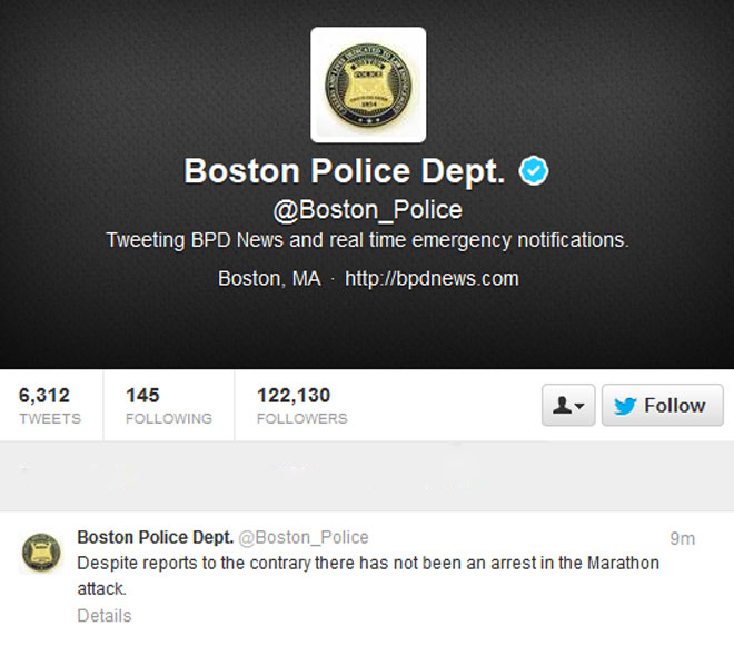 Στις 21.40 ώρα Ελλάδας η αστυνομία της Βοστώνης με ανάρτηση στο twitter ανέφερε πως παρά τα όσα λέγονται δεν υπήρχε καμία σύλληψη.