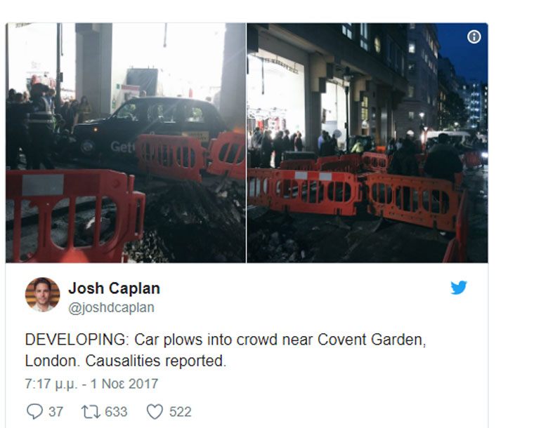 Ταξί έπεσε πάνω σε πεζούς στο Λονδίνο κοντά στο Κόβεντ Γκάρντεν μεταδίδουν τα διεθνή Μέσα τα οποία τονίζουν πως σύμφωνα με την αστυνομία δεν πρόκεται για τρομοκρατικό χτύπημα. Προς το παρόν δεν υπάρχουν πληροφορίες για θύματα.